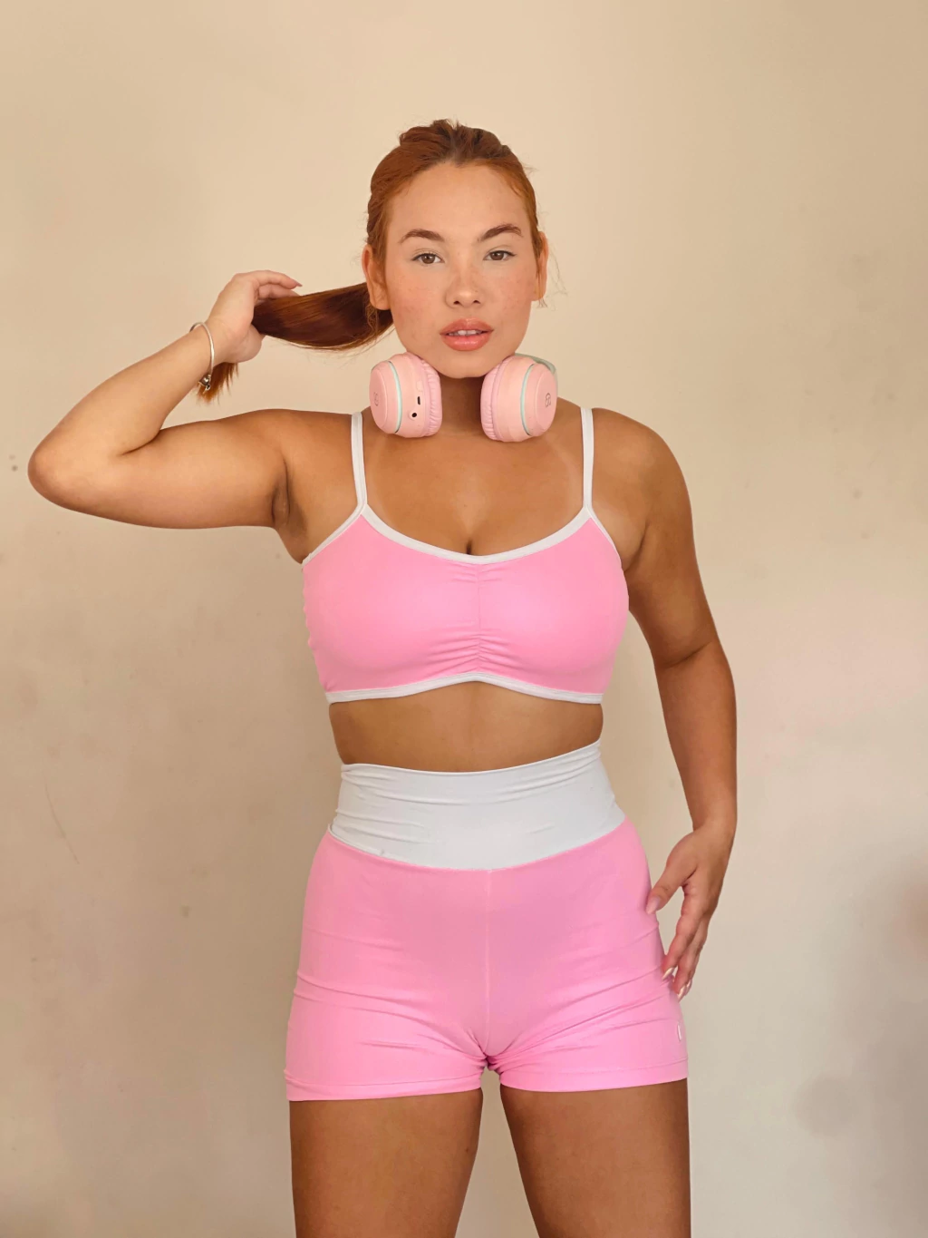 Descubra o charme do Top Algodão Doce, um modelo novo que une delicadeza e performance. O destaque fica por conta do trapeado central na cor rosa bebê, que confere um toque elegante e moderno à peça.